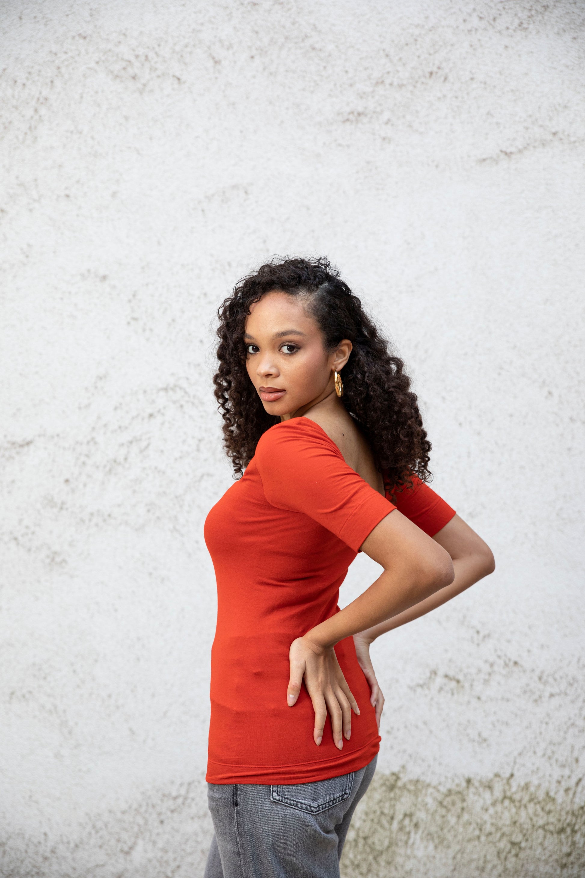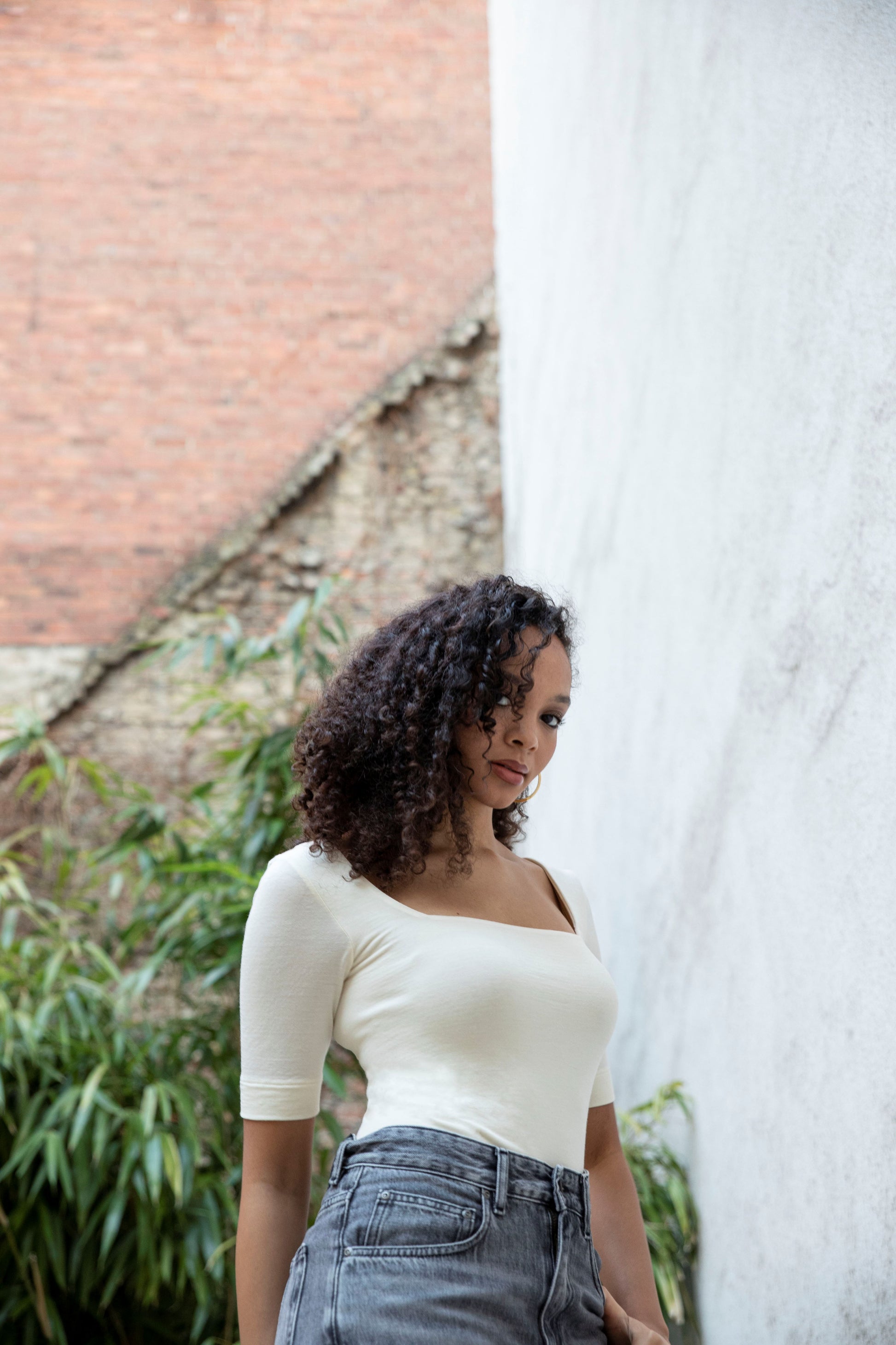 wear the MIA top with a blazer for an effortlessly intelligent look. wear with an open pullover sweater to showcase the bustier-gone-elegant look. the elevated version of a t-shirt, the MIA top is to be worn with anything from jeans to leather pants. refine any casual look or make any formal outfit look easy, with the MIA top.